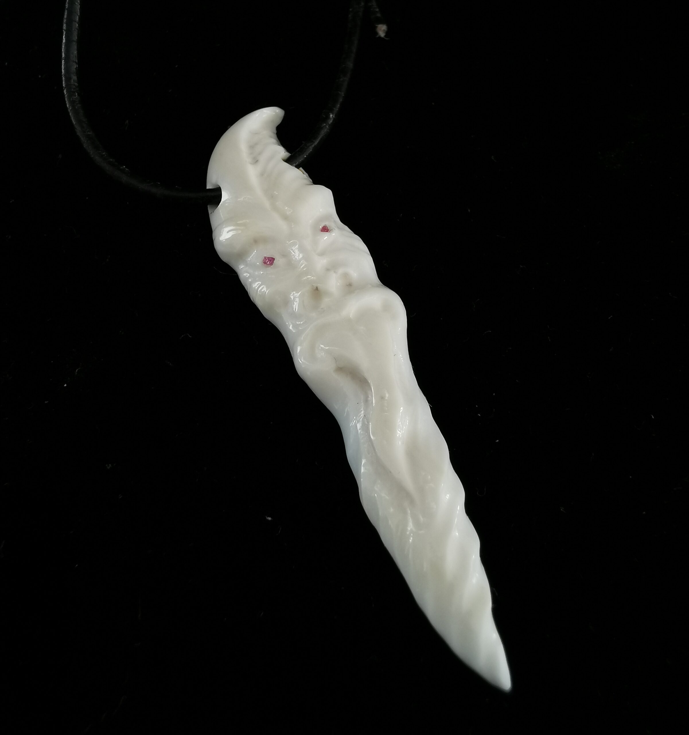 Carved in tusk from narwhal. Eyes in ruby stone