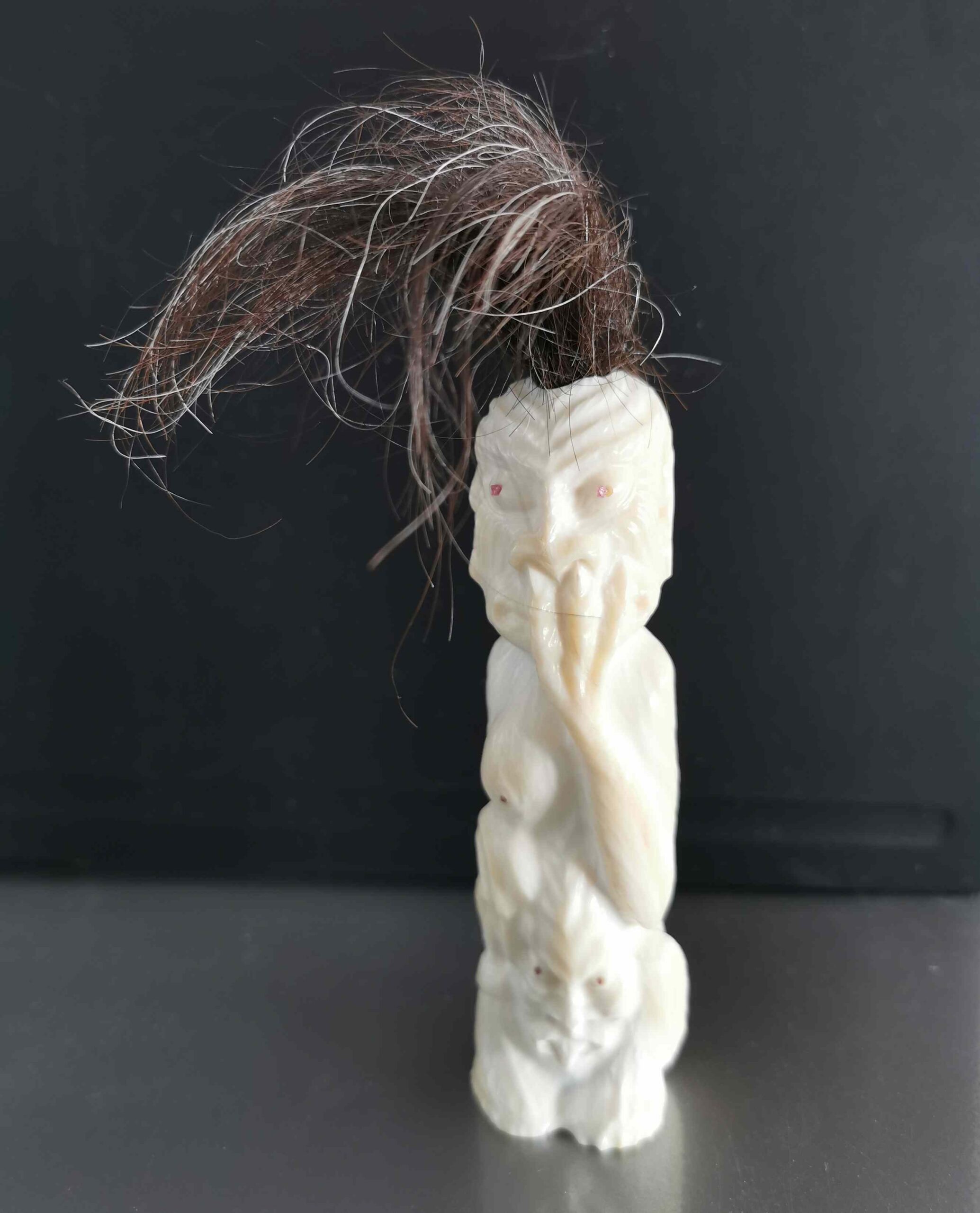 Carved in Tooth from Narwhal, hair from Musk ox, eyes made from Ruby stone.